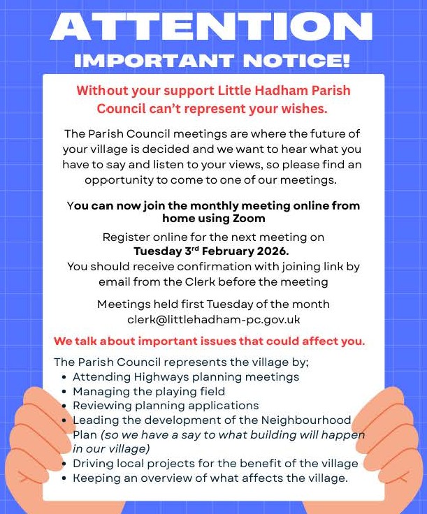 Join your Parish Council meeting via zoom. Give you a chance to see what is happening in the village without leaving your front room. You only need to email the clerk for the link clerk@littlehadam-pc.gov.uk. Simply click on the link and you join the meeting. You can choose to be anonymous and not turn on your camera.